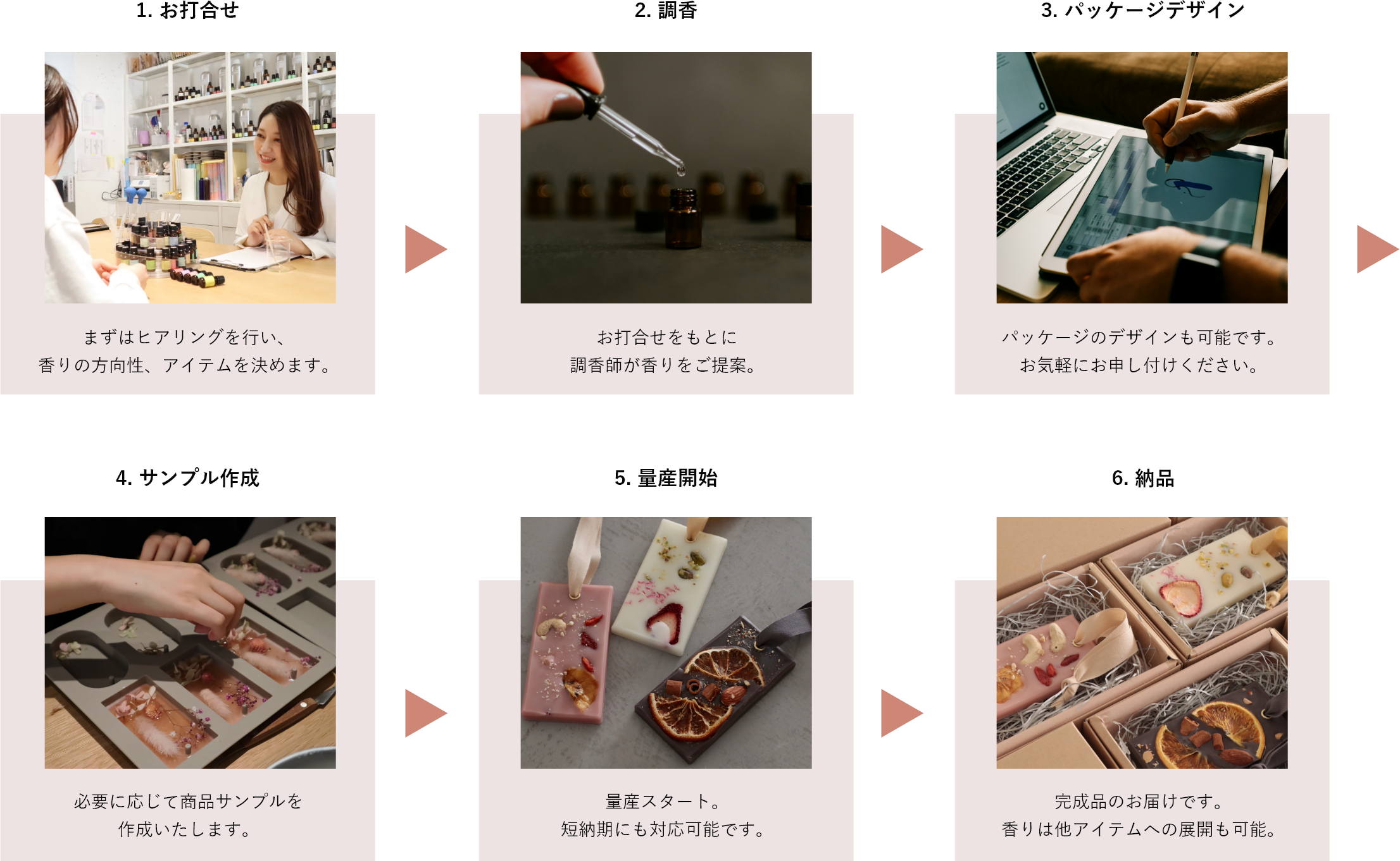 ④決定した香りで製品化を行います。完成した香りは他アイテムへの展開も可能です。